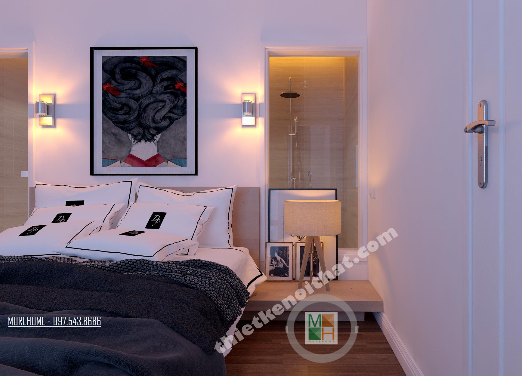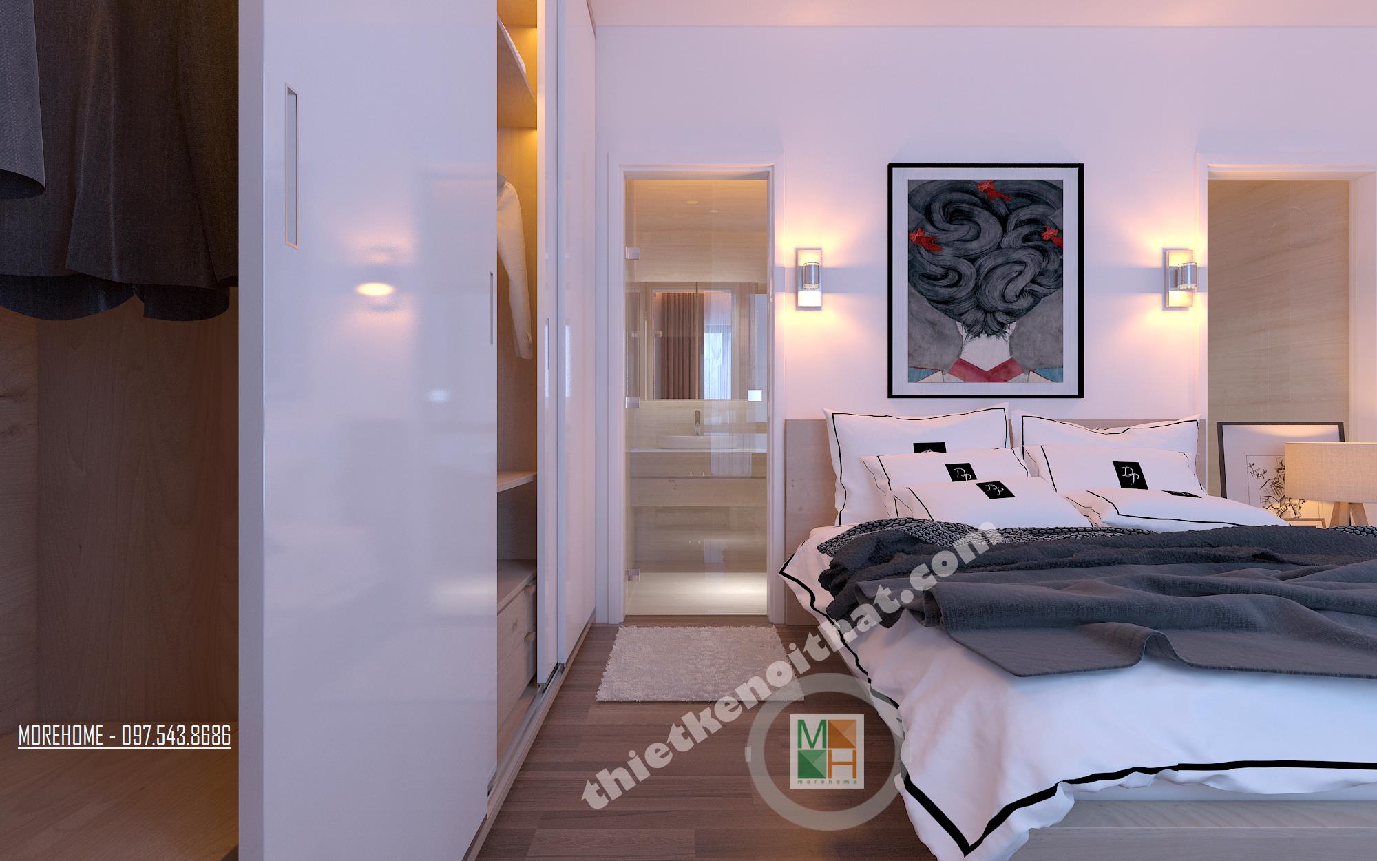 Cuối cùng là thiết kế nội thất phòng ngủ lớn hiện đại. Ánh sáng tự nhiên được tận dụng mang đến sức sống cho căn phòng. Thiết kế tủ đồng nhất gần như tạo thành tường mang lại cho gia chủ cảm giác gọn gàng mà vẫn không ảnh hưởng đến diện tích phòng. Thay vì đặt bàn ghế bên cửa số, kiến trúc sư đã sử dụng kệ ngồi kết hợp tủ đồ và bàn làm việc, thiết kế sáng tạo tận dụng ánh sáng tự nhiên, kết hợp nhiều vật dụng trong một giúp tăng tính công năng mà vẫn đảm bảo tiết kiệm không gian.