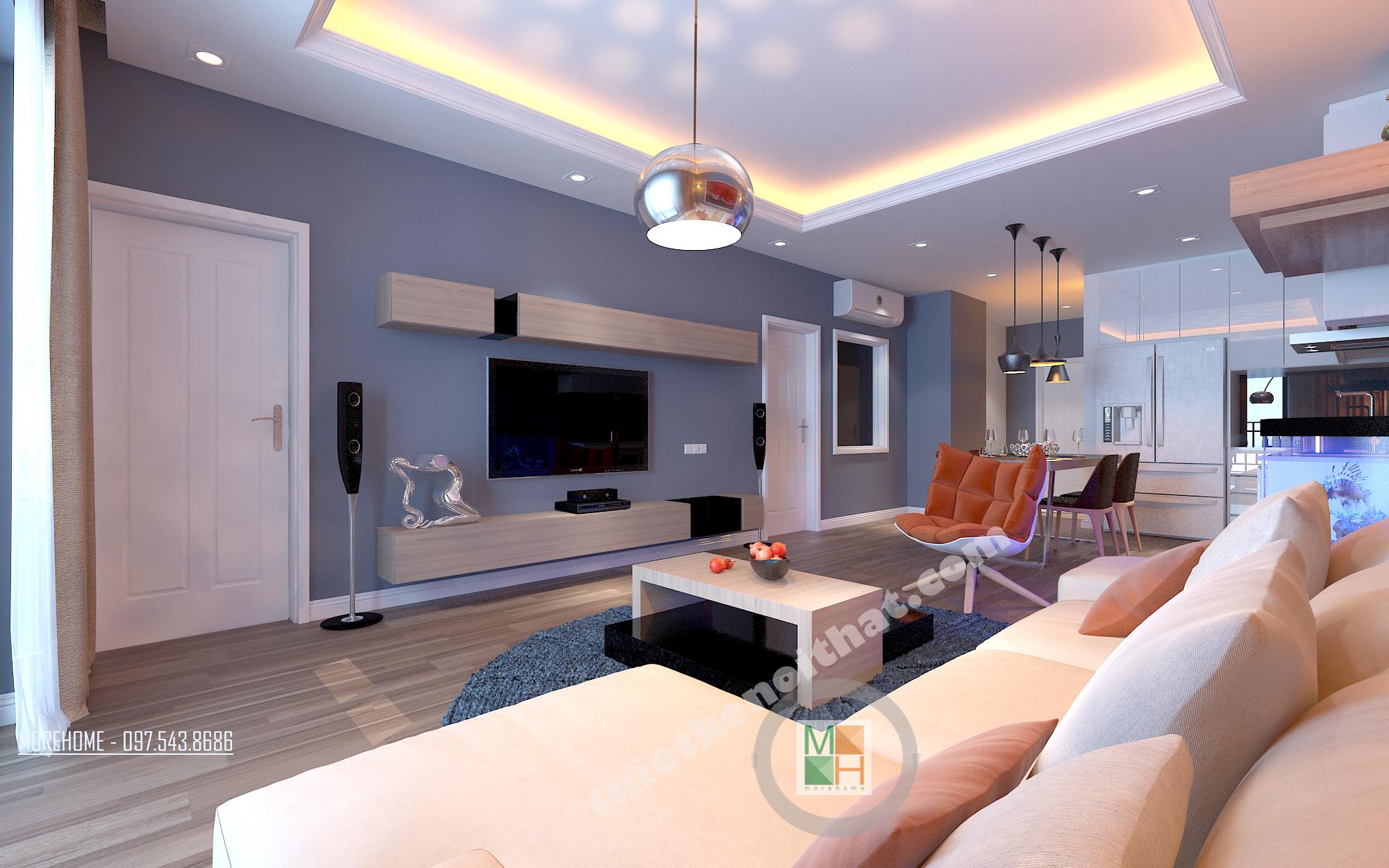 Thiết kế nội thất phòng khách lấy ánh sáng tự nhiên làm nổi bật không gian sinh hoạt chung và mang lại sức sống cho các thành viên trong gia đình. Thiết kế sofa đơn giản và có kích thước to bản gợi cảm giác vững chãi và an toàn. Thông thường, kệ ti vi sẽ chiếm một diện tích khá lớn làm ảnh hưởng đến sinh hoạt các các thành viên trong gia đình. Chính vì vậy, với một không gian hẹp như chung cư điều này lại càng bất tiện, kiến trúc sư đã khéo léo thiết kế tivi gọn gần như đồng nhất với tường, tủ kệ được tối giản hóa nhằm tạo độ thoáng cho không gian. Tuy nhiên vẫn giữ được sự tiện nghi trong căn nhà. Không gian sẽ khá đơn điệu nếu không có sự xuất hiện của bế cá cảnh hay bức tranh treo tường. Với thiết kế này, tính thẩm mỹ và hài hòa về màu sắc được tăng lên đáng kể thu hút sự chú ý của mọi người.