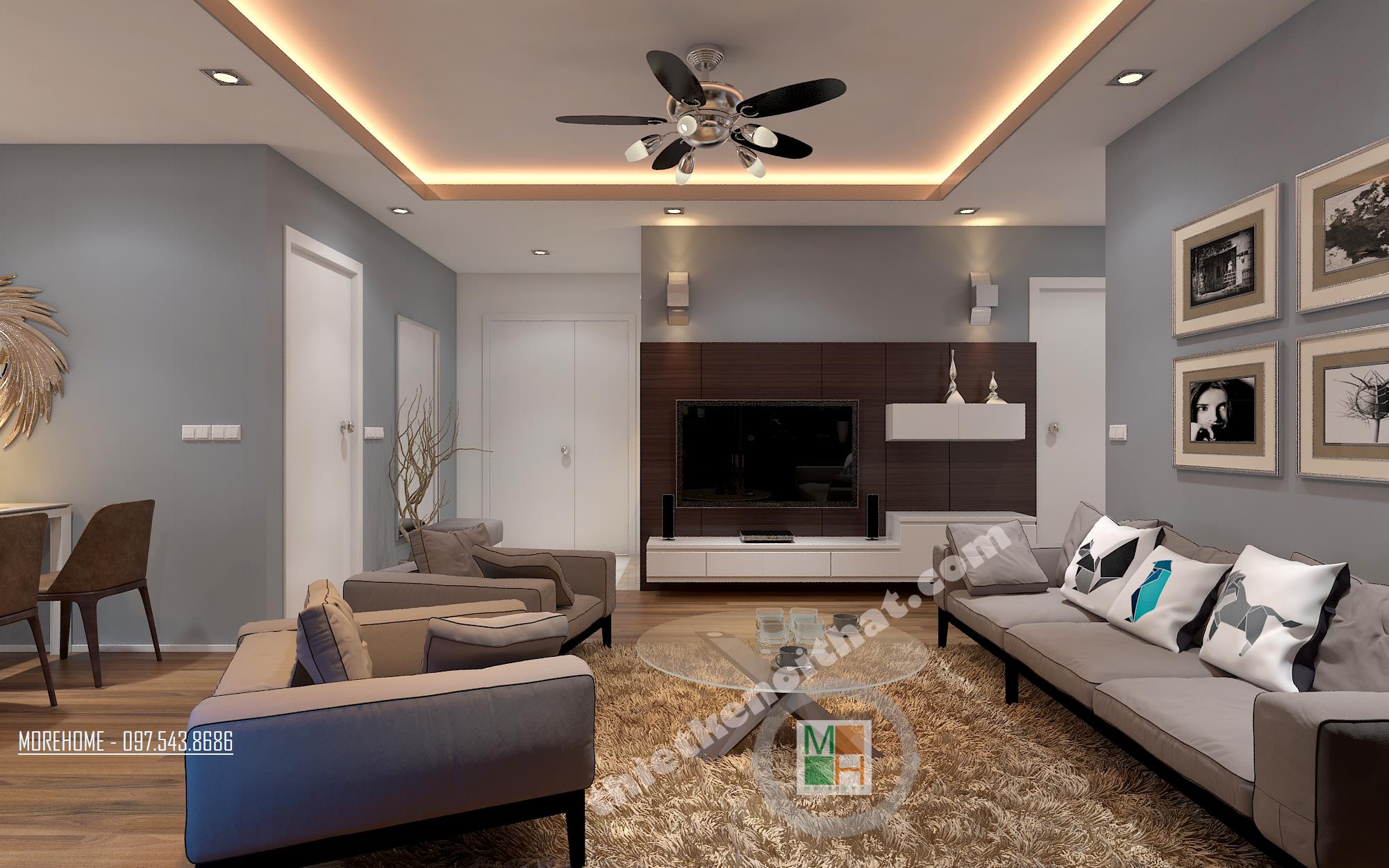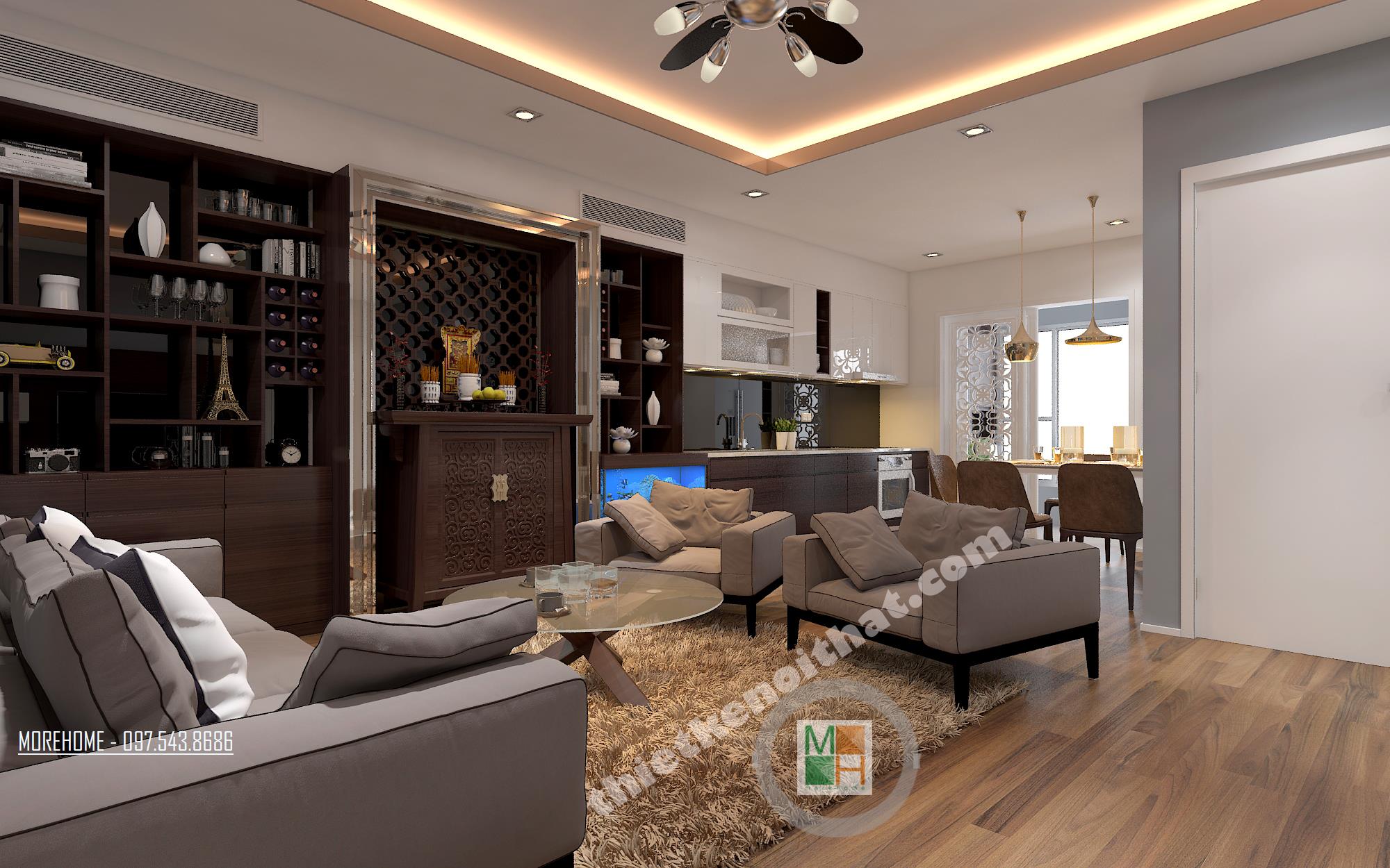 Thiết kế nội thất phòng khách hiện đại chung cư CT4 Sông Đà sử dụng tông màu ghi sáng và trắng làm nền, sắc nâu trầm từ veneer đồ gỗ là điểm nhấn màu sắc cho không gian sinh hoạt chung này. Chúng ta có thể dễ dàng nhận thấy thiết kế sofa to rộng trải dài cả phòng khách, đây chính là một dụng ý của kiến trúc sư. Với kết cấu như vậy, căn phòng mang đến cho gia chủ cảm giác an toàn và vững chãi. Bên cạnh đó, thiết kế sofa đơn giản, khá linh hoạt với một không gian hạn chế như thiết kế nội thất chung cư. Thiết kế không gian tâm linh cũng được khéo léo sắp đặt ngay giữa trung tâm mang lại sự yên bình. Mặc dù vậy, khi đặt góc tâm linh ở một không gian mở như phòng khách cũng có phần gây bất tiện khi trẻ nhỏ muốn nô đùa. Để khắc phục nhược điểm này, kiến trúc sư đã dành riêng một không gian đa năng phía đối diện phù hợp cho các hoạt động của trẻ và các thành viên trong gia đình.