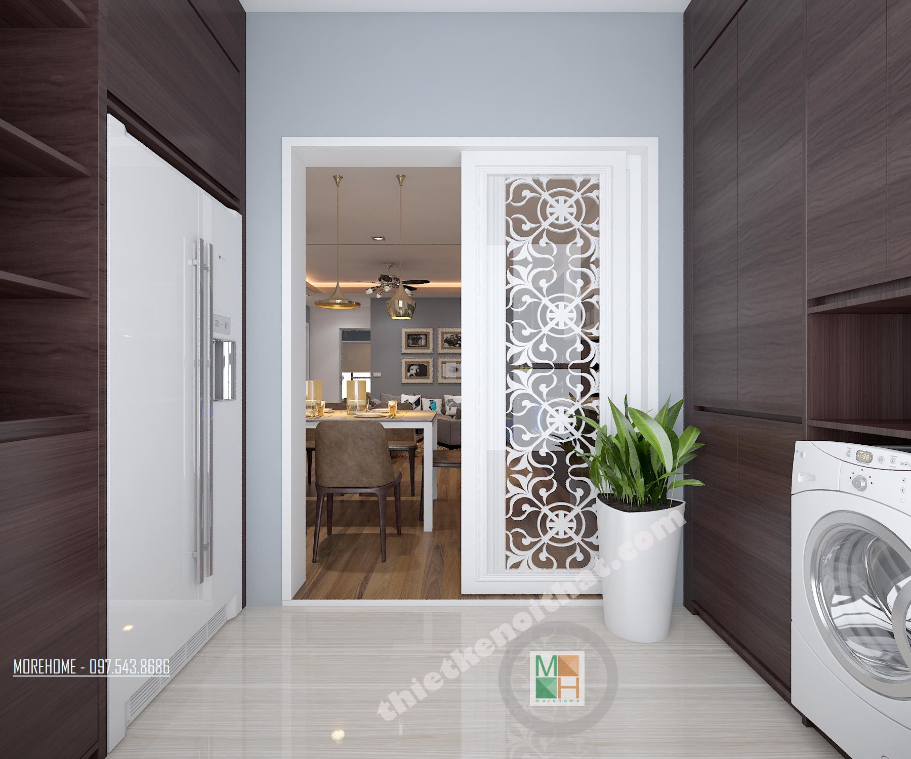 Không gian phòng bếp được khéo léo đặt ngay gần bàn ăn và liền kề với phòng khách, tạo thuận lợi cho sinh hoạt của gia đình. Thiết kế không gian sinh hoạt chung ngay gần ban công, vì vậy ánh sáng tự nhiên được tận dụng mang lại sức sống và sự thoải mái cho gia chủ. Bên cạnh đó, thiết kế cửa gỗ ngăn cách hay các bức tường thô cứng được thay thế bằng khung gỗ và cửa kính cường lực với hoa văn trạm khắc trang nhã vừa tăng tính thẩm mỹ lại đảm bảo tính công năng và tạo ấn tượng cho gia chủ.