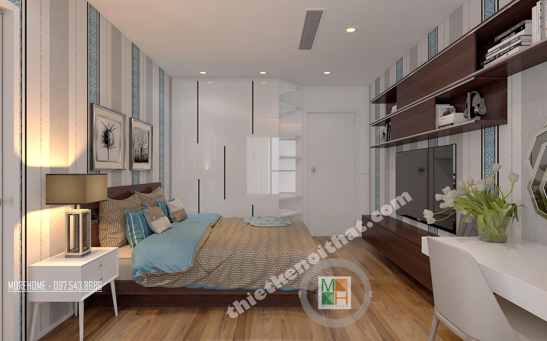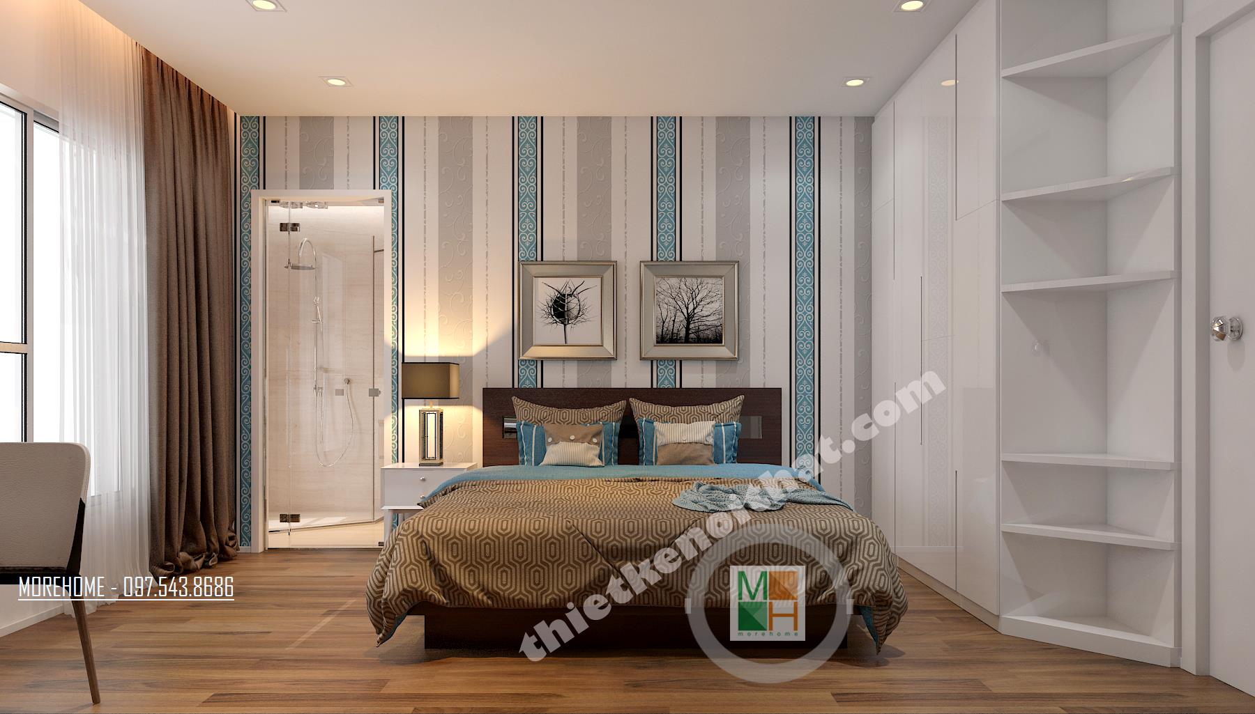 Thiết kế nội thất phòng ngủ tận dụng ánh sáng tự nhiên giúp không gian trở nên cân bằng và gần gũi. Thiết kế tường sơn đơn sắc được tô điểm bằng giấy dán tường hoa văn đơn giản tạo điểm nhấn cách tân và cũng rất linh hoạt khi muốn thay đổi. Một trong những thiết kế nổi bật của căn phòng ngủ này chính là thiết kế kệ kết hợp tủ kệ tủ quần áo. Với thiết kế hai trong một này, diện tích phòng được tiết kiệm đáng kể mà không làm giảm tính công năng hay gây khó chịu cho người sử dụng. Ngoài ra, thiết kế này còn thu hút sự chú ý và tạo điểm nhấn sáng tạo cho căn phòng.