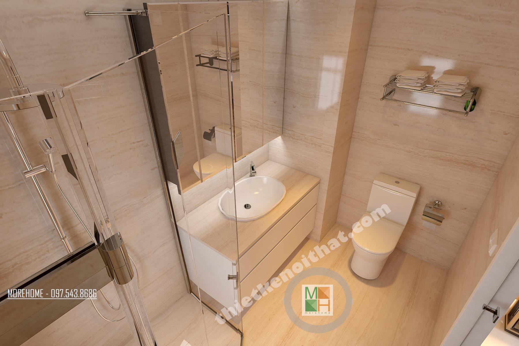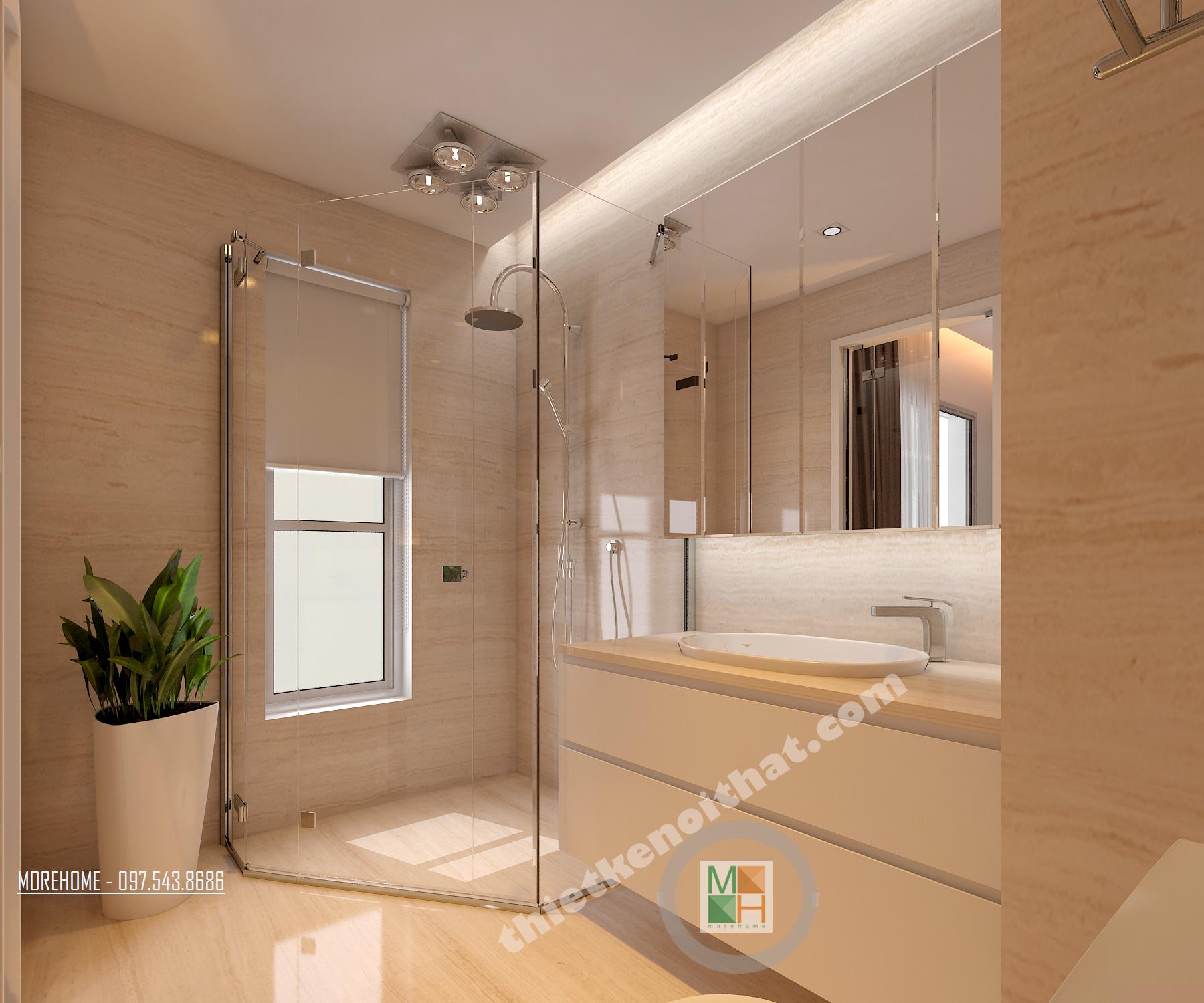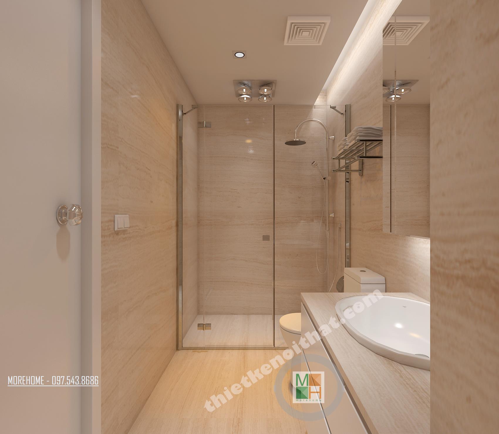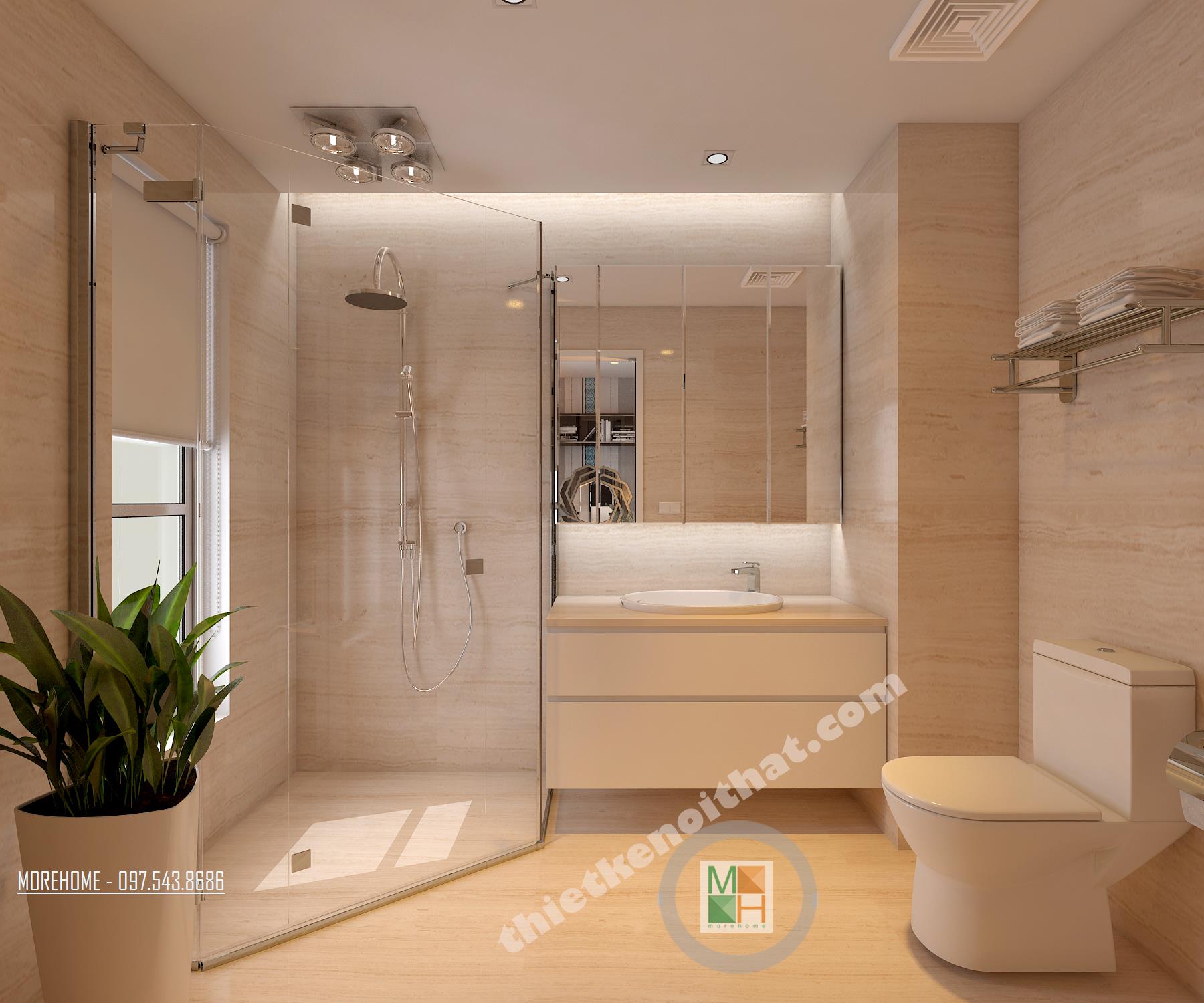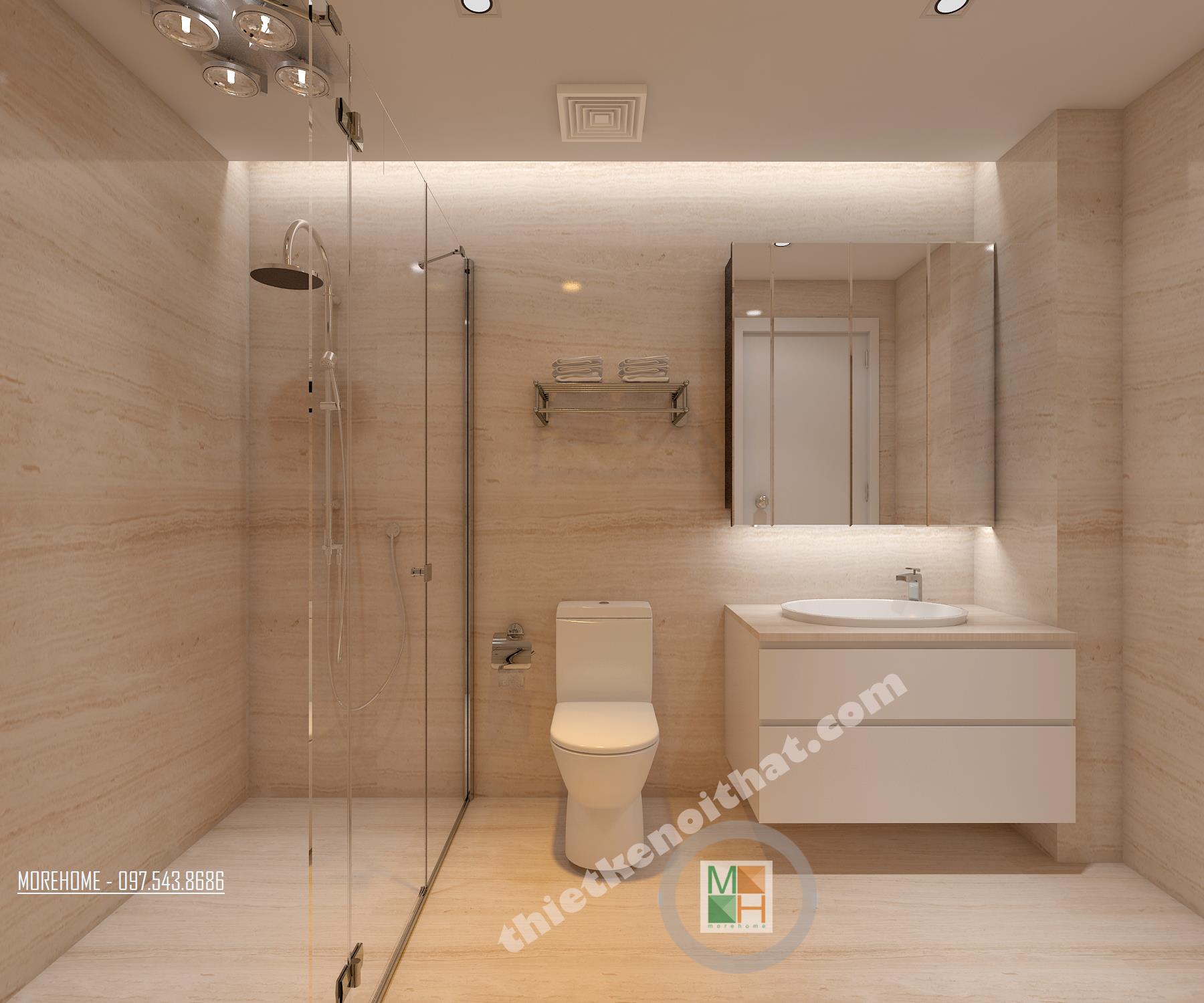 Cuối cùng là thiết kế nội thất phòng tắm hiện đại. Đá tự nhiên tông màu sáng được sử dụng để ốp xung quanh tường mang đến cảm giác tự nhiên và mát mẻ cho căn phòng. Không gian sử dụng kính cường lực và gương tạo độ phản chiếu hài hòa, mang đến cảm giác cơi nới cho căn phòng.