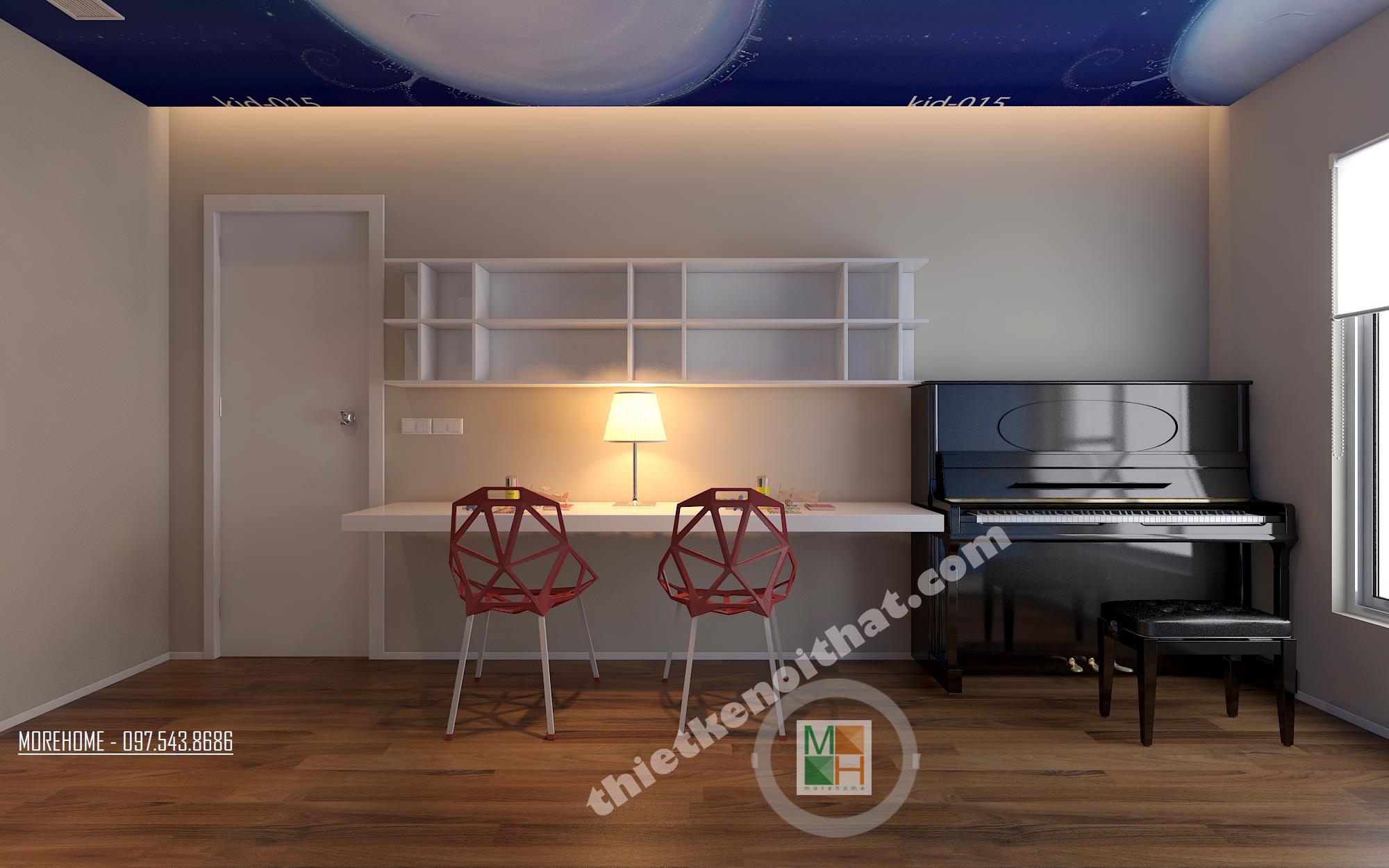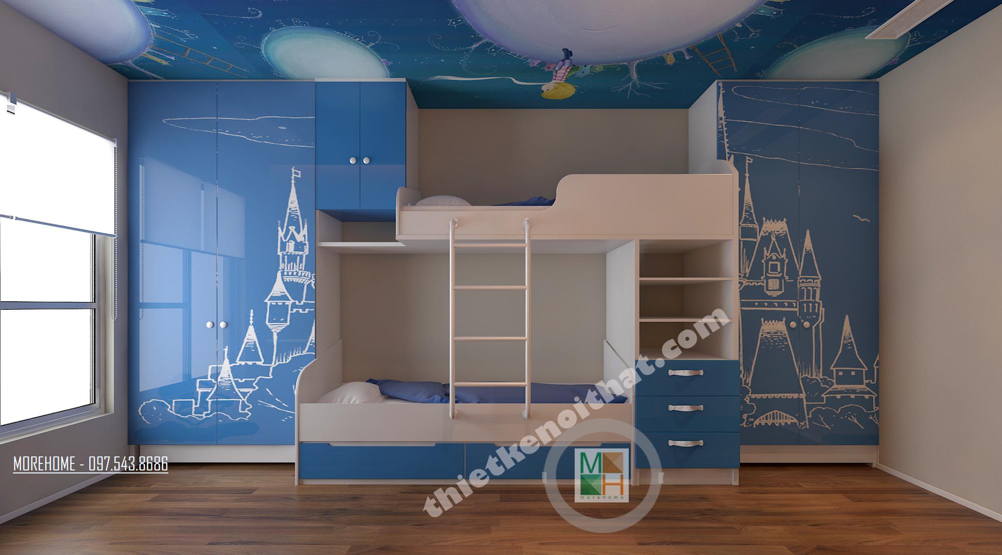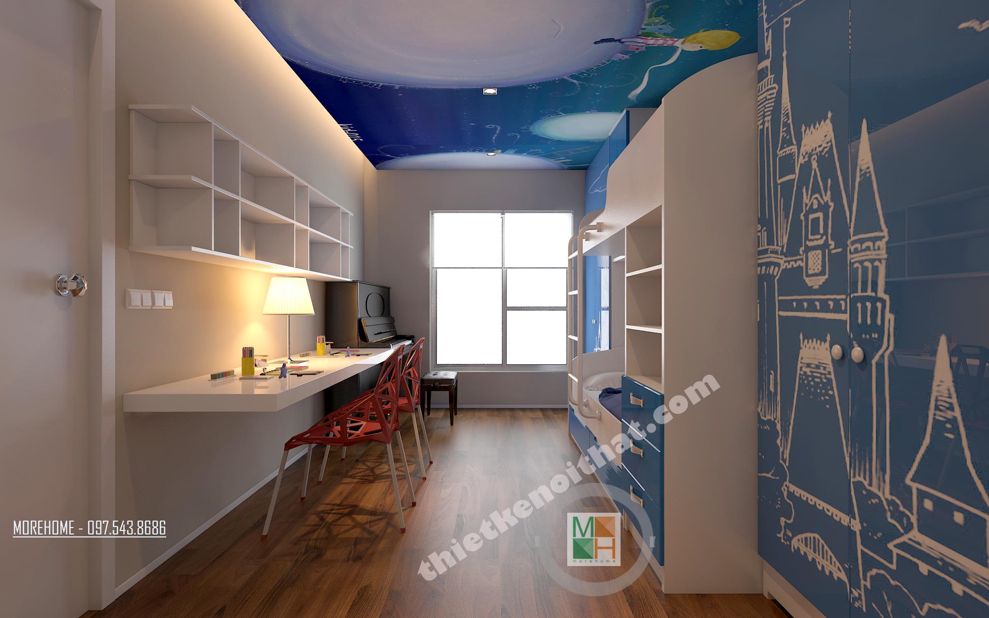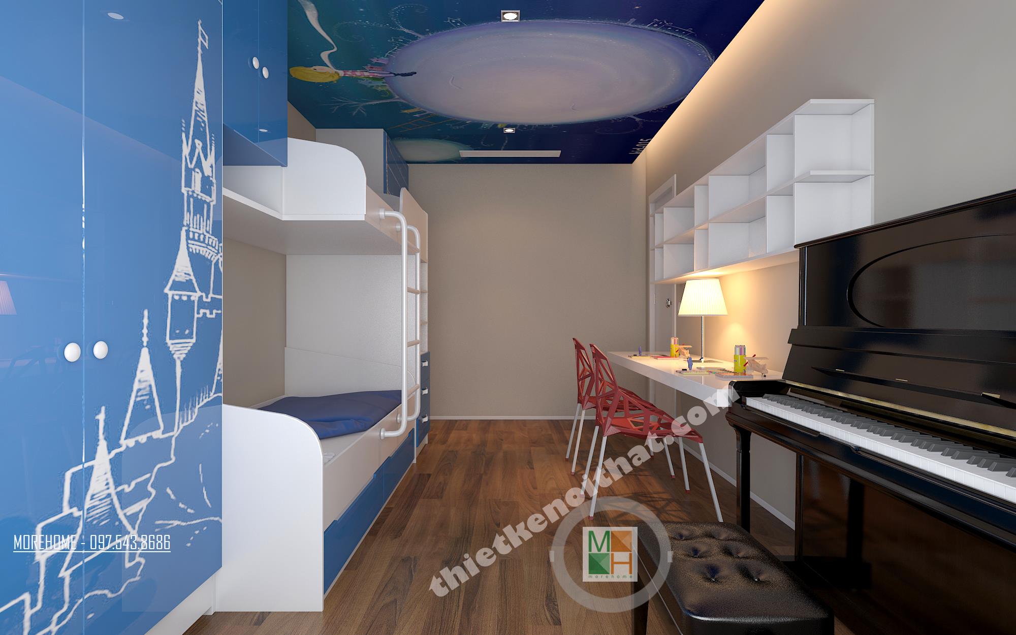 Thiết kế nội thất phòng ngủ cho trẻ mang đến cho ta cảm giác thân thiện và vô cùng gần gũi. Các họa tiết trên tường hay trên trần nhà gợi một thế giới huyền ảo và mơ mộng phù hợp để kích thích trí tưởng tượng của trẻ nhỏ. Bên cạnh đó thiết kế giường ngủ kết hợp kệ đồ giúp tiện kiệm không gian, tạo khoảng trống cho các hoạt động của trẻ.