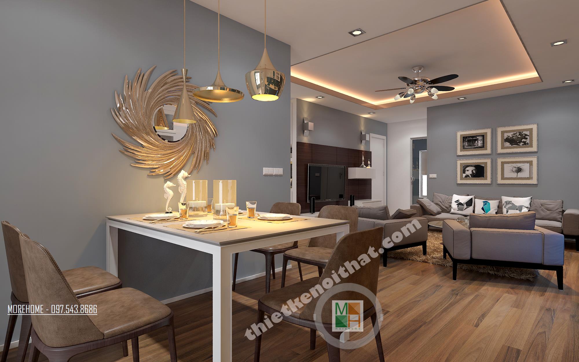 Với kết cấu thô hạn chế về mặt diện tích, thiết kế nội thất bàn ăn được đặt liền kề với phòng khách và không hề có vách ngăn từ đó tạo độ thoáng cho căn phòng. Thiết kế bàn ăn đơn giản không tốn quá nhiều diện tích phù hợp với gia đình nhỏ và diện tích không gian hẹp. Bàn ăn tông màu nâu đơn sắc phù hợp với màu nền, góp phần định hình phong cách thiết kế và cái Tôi của gia chủ. Một vài điểm nhấn thiết kế khác như gương phản chiếu, đèn trang trí với màu vàng ánh kim gợi cảm giác sang trọng và ấm cúng cho căn phòng.