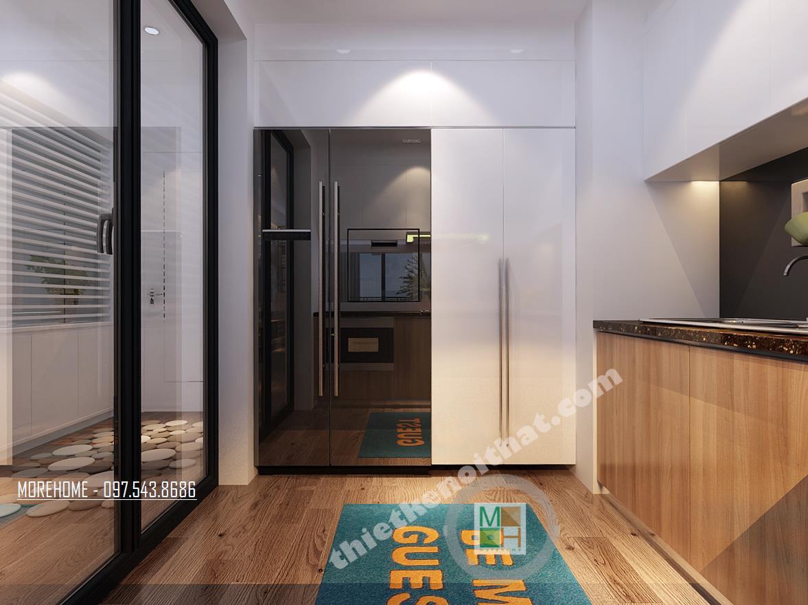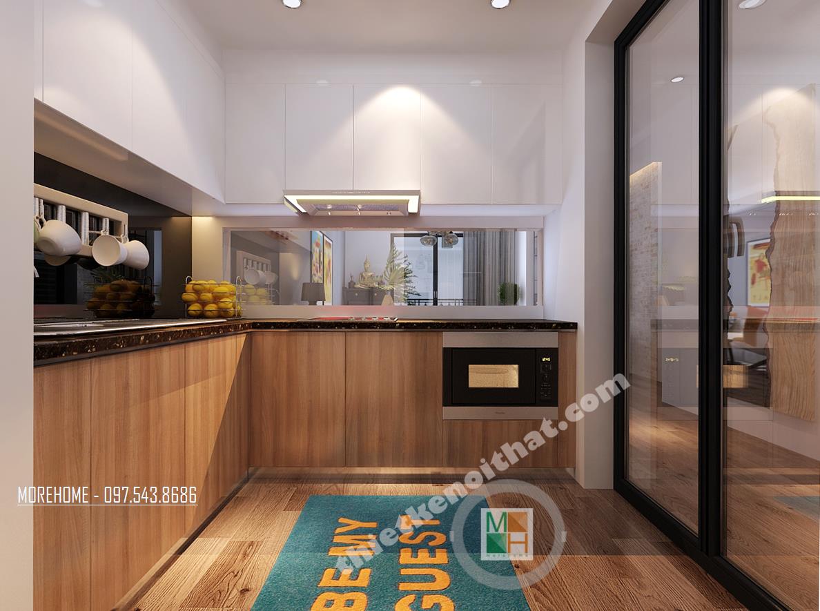 Thiết kế nội thất phòng bếp hiện đại sử dụng cửa kính cường lực giúp tạo độ mở cho căn phòng. Diện tích phòng bếp không quá rộng nhưng được bố trí hợp lý thành một căn phòng nhỏ nhưng vẫn không gây ra cảm giác bí bách và khó chịu. Điểm đặc biệt nhất của căn phòng này có lẽ là thiết kế khung chữ nhật khá to nhìn thẳng và thông với khu vựa bàn ăn. Nhìn vào thiết kế này, ta có thể dễ dàng thấy sự tương đồng với những nhà hàng hiện đại, trẻ trung, kiểu thiết kế này cũng giúp tọa tầm nhìn rộng và bao quát gần như liên thông với phòng ăn. Thiết kế kệ tủ bếp đơn giản với tông màu veneer sáng mang đến hiệu ứng ánh sáng và màu sắc hài hòa với tông màu trắng gợi cảm giác dễ chịu và tinh tế.