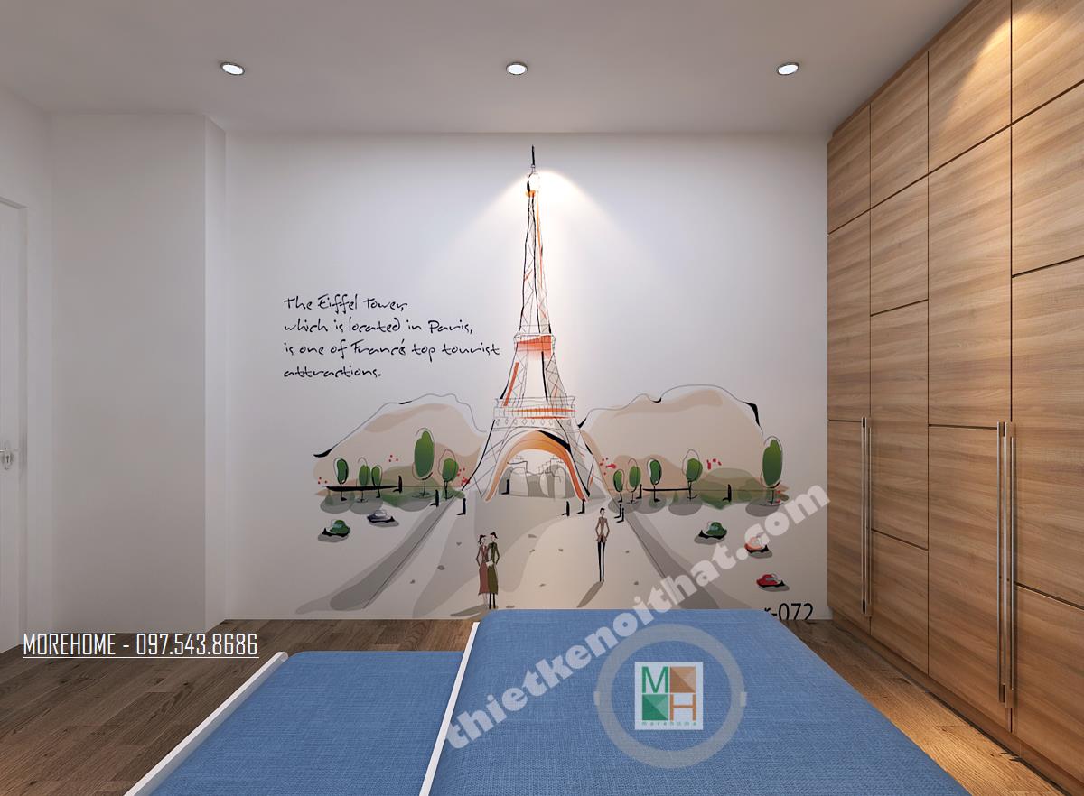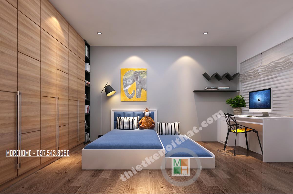 Thiết kế phòng ngủ hiện đại với tông màu xám trắng làm chủ đạo. Thiết kế tạo điểm nhấn màu sắc ở một vài chi tiết trang trí như giường ngủ và tranh sáng tạo. Kiến trúc sư sử dụng các chi tiết tối giản để làm tăng diện tích cho căn phòng. Hệ thống tủ gỗ thiết kế đơn giản gần như đồng nhất với tường. Kệ tủ được sắp xếp hợp lý ngay cạnh tủ áo tạo độ phẳng gần như một bức tường mang đến sự mới lạ và tiện nghi rất hiện đại. Thay vì sơn tường đơn sắc như truyền thống, kiến trúc sư sử dụng giấy dán tường 3D làm tăng hiệu ứng hình ảnh và gợi sự sáng tạo. Ngoài ra, căn phòng không có cửa, ánh sáng tự nhiên bị hạn chế, để khắc phục điều này, kiến trúc sư đã khéo léo mở một khung cửa thông với không gian sinh hoạt chung bên ngoài phòng vừa khắc phục nhược điểm lại tạo sự gần gũi.