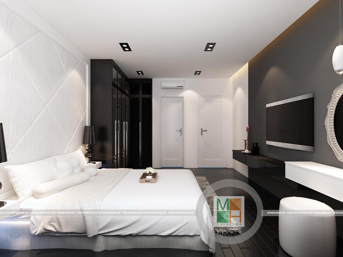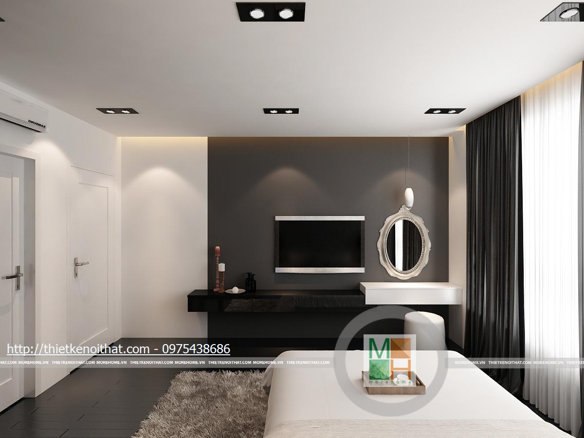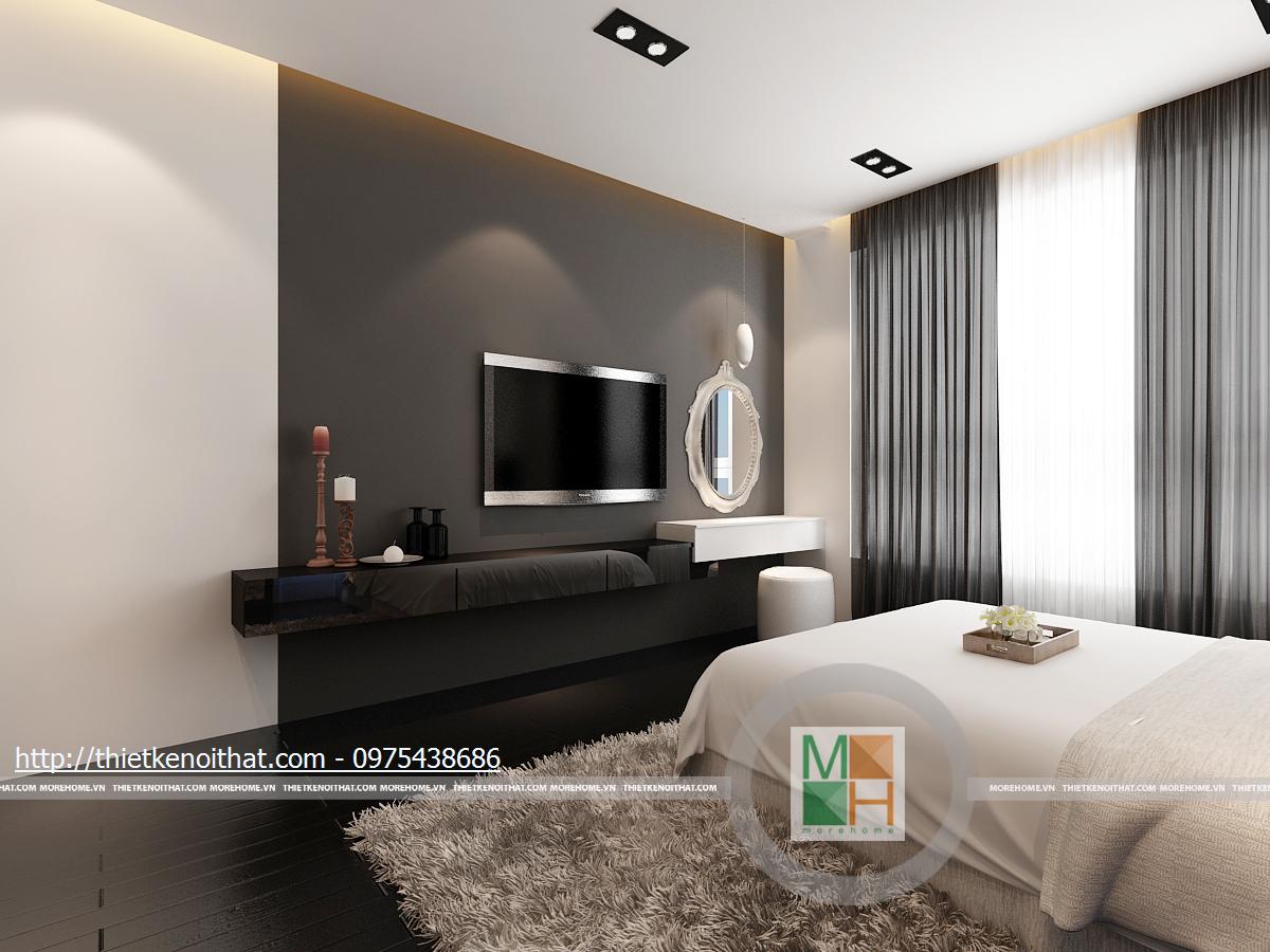 Phòng ngủ phụ sử dụng những mảng màu đen với mật độ cao: sàn nhà, tủ quần áo, rèm cửa... Tuy nhiên, với ô cửa sổ rộng và bộ ga giường lớn màu trắng, căn phòng vẫn mang nét khoáng đạt, hài hòa. Kệ tivi và bàn trang điểm được gắn liền kề nhau ở trên tường, tạo sự liên kết chắc chắn.