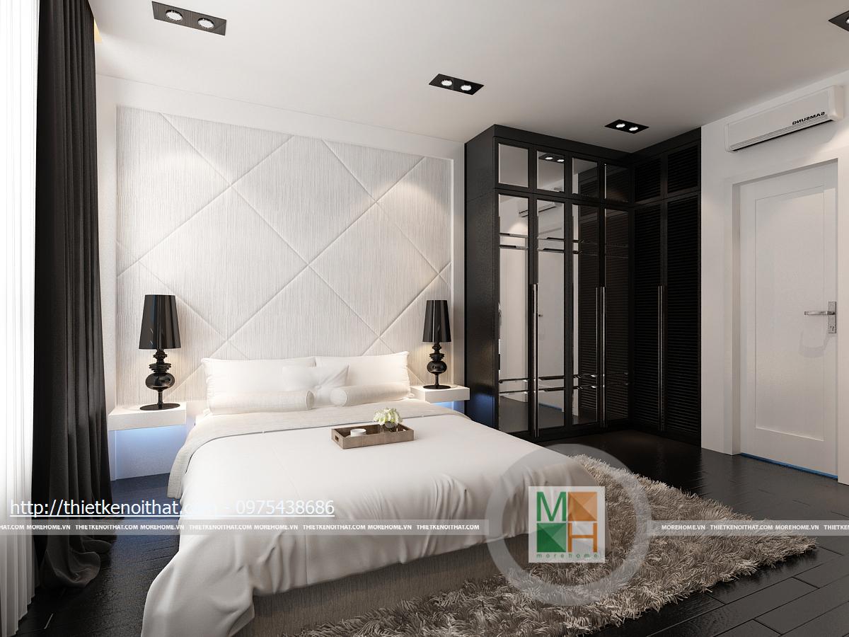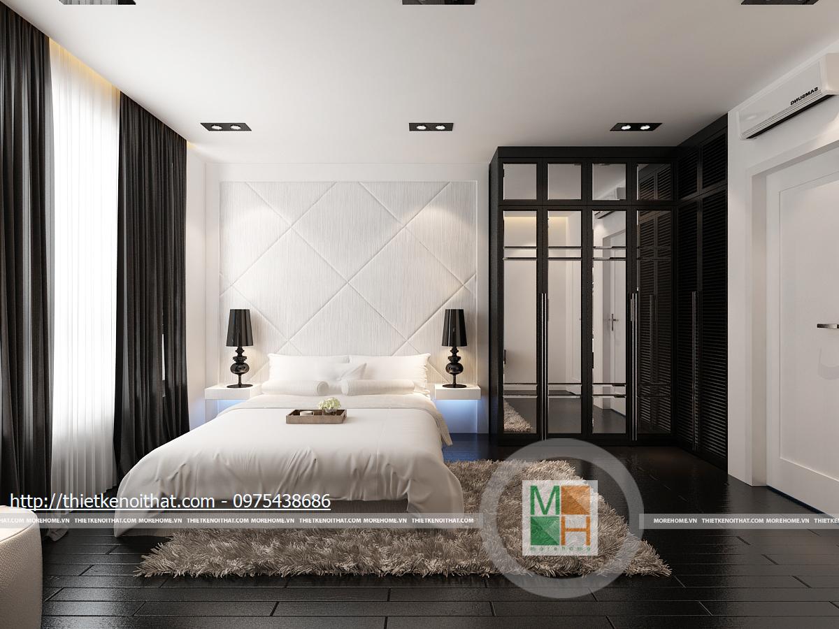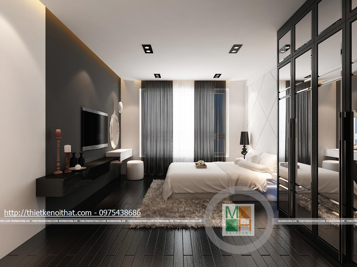 Phòng ngủ phụ sử dụng những mảng màu đen với mật độ cao: sàn nhà, tủ quần áo, rèm cửa... Tuy nhiên, với ô cửa sổ rộng và bộ ga giường lớn màu trắng, căn phòng vẫn mang nét khoáng đạt, hài hòa. Kệ tivi và bàn trang điểm được gắn liền kề nhau ở trên tường, tạo sự liên kết chắc chắn.