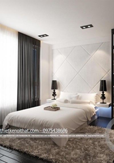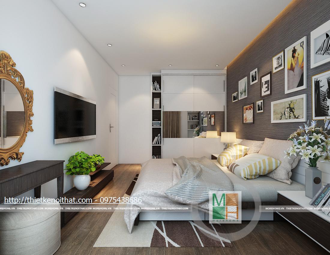 Phòng ngủ chính với thiết kế nội thất ấn tượng nhờ cách treo tranh ảnh trang trí. Mảng tường đầu giường được dán giấy màu ghi để làm sống động thêm các bức hình ở trên. Tủ sách và tủ quần áo cao sát trần để ăn gian diện tích và tăng khả năng lưu trữ. Chiếc gương treo ở bàn trang điểm với những đường nét cách điệu đem đến sự sang trọng và quyến rũ. Có thể tô điểm thêm sắc xanh vào căn phòng bằng những chậu cây, lọ hoa nhỏ nhắn.