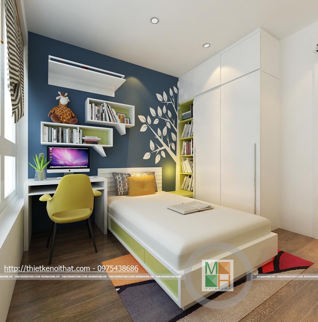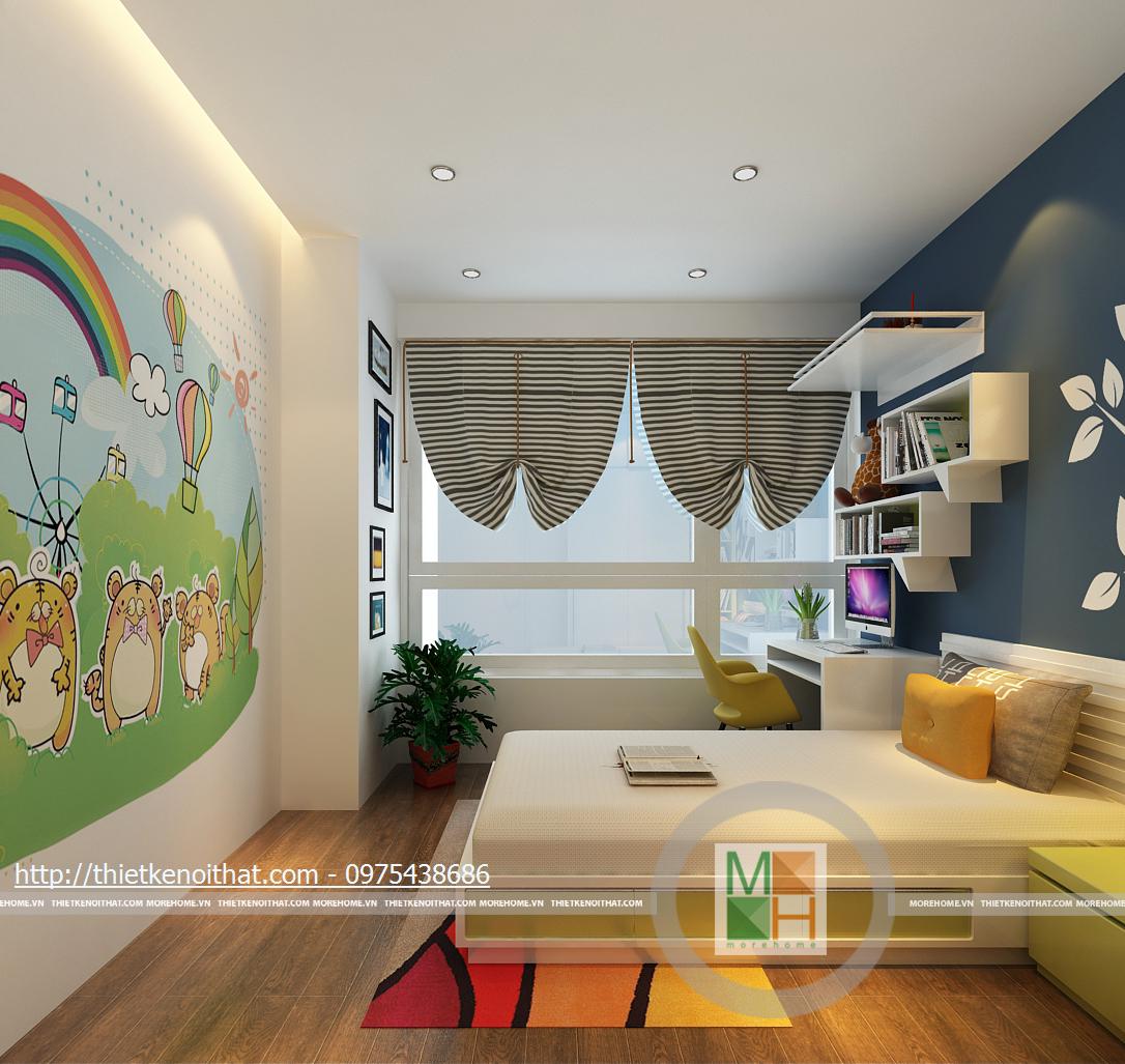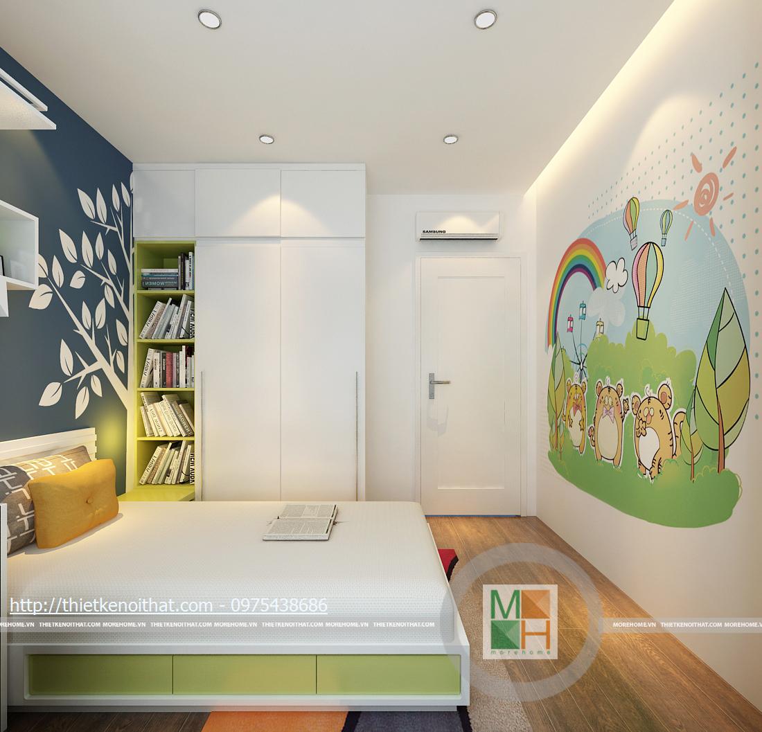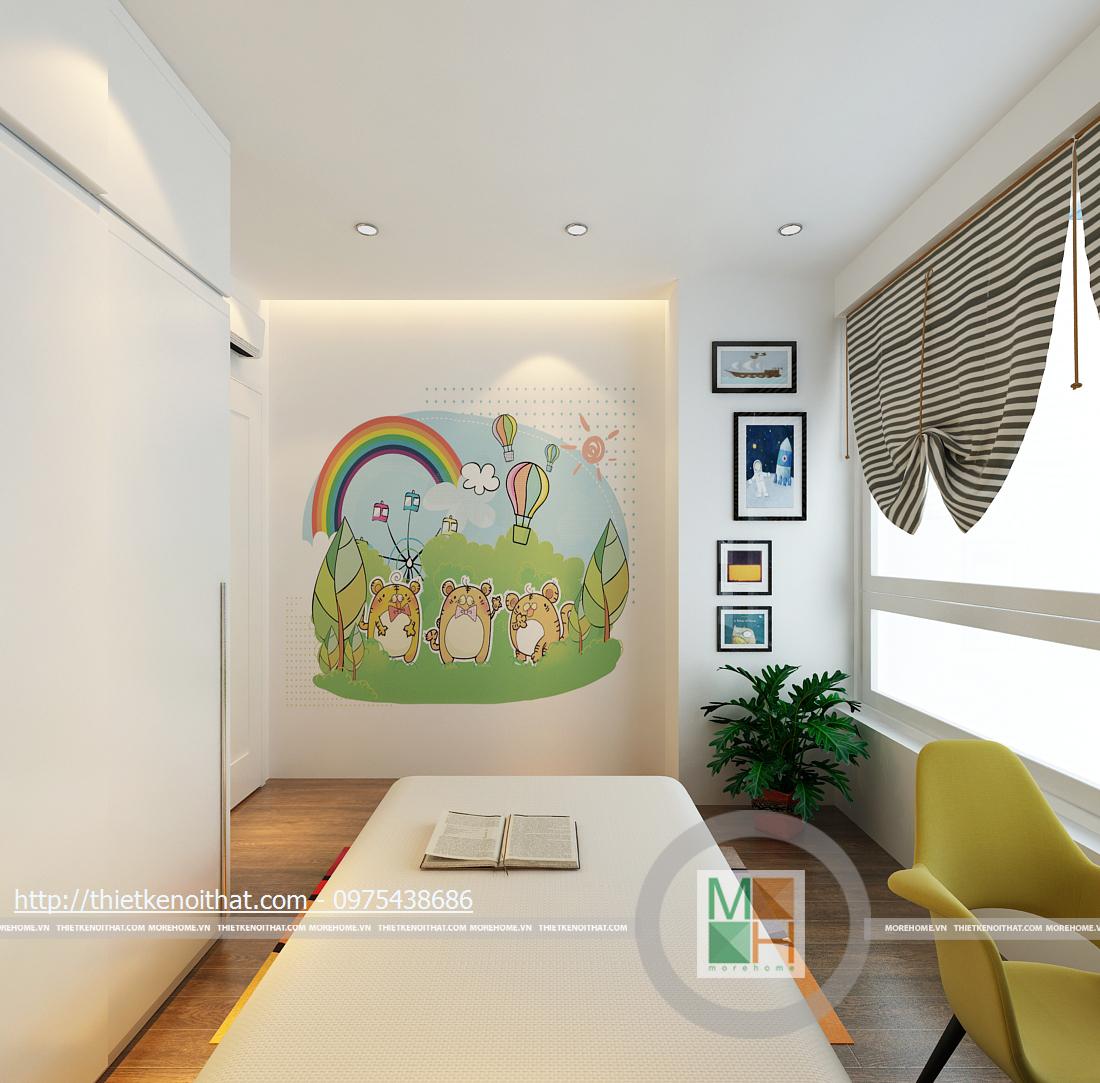 Phòng ngủ của con vẫn sử dụng tông màu sáng và nền gỗ như phòng bố mẹ nhưng điểm nhấn là những họa tiết vui mắt được trang trí trên tường. Bàn học và giá sách không cầu kì nhưng đem lại sự thoải mái cho bé cả khi học lẫn chơi. Nội thất trong phòng được kê gọn gàng và sát vào tường để bé có thêm không gian vận động, phát triển thể chất. Ô cửa sổ được làm kịch tường để có thể sử dụng thêm ánh sáng tự nhiên bên ngoài.