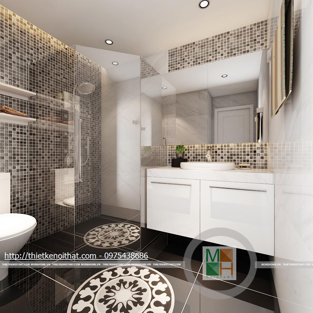 Cách thiết kế phòng tắm với bồn tắm đứng cùng với phần sàn đen tương phản và phần gạch ốp trắng sạch sẽ. Kệ lưu trữ bằng gỗ được sơn trắng được bố trí dưới bồn rửa đê có thể cất những vật dụng cần thiết. Một phần tường sử dụng gạch ốp mosaic để tạo điểm nhấn và đem đến những giây phút thư giãn nhất sau ngày làm việc căng thẳng.