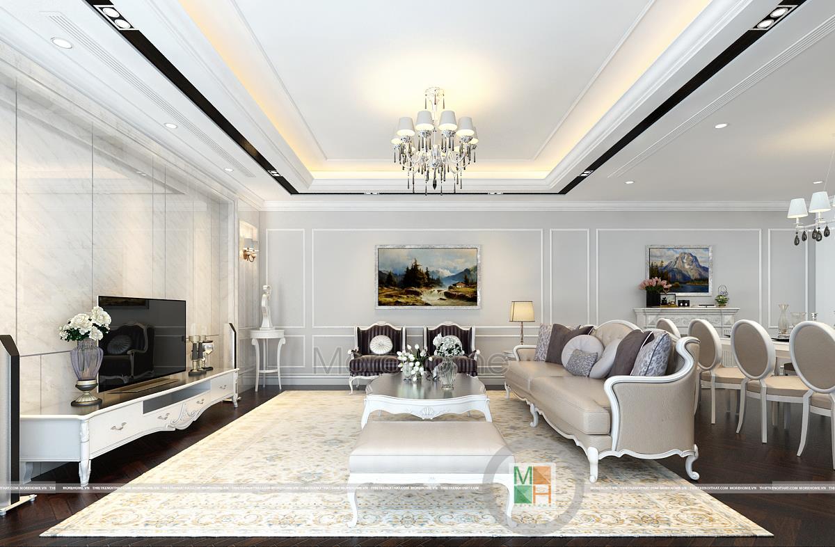 Thiết kế nội thất phòng khách tân cổ điển sử dụng tone màu chủ đạo là đen và trắng mang lại cảm giác hiện đại và sang trọng. Không gian nền trắng cũng góp phần lớn tạo cảm giác cơi nới cho không gian và tăng độ sáng cho căn phòng. Ngoài ra, thiết kế ánh sáng âm trần mang đến sự cân bằng giữa ánh sáng tự nhiên và ánh sáng hiện đại giúp không gian sống trở nên hài hòa, gợi cảm giác yên bình, dễ chịu.