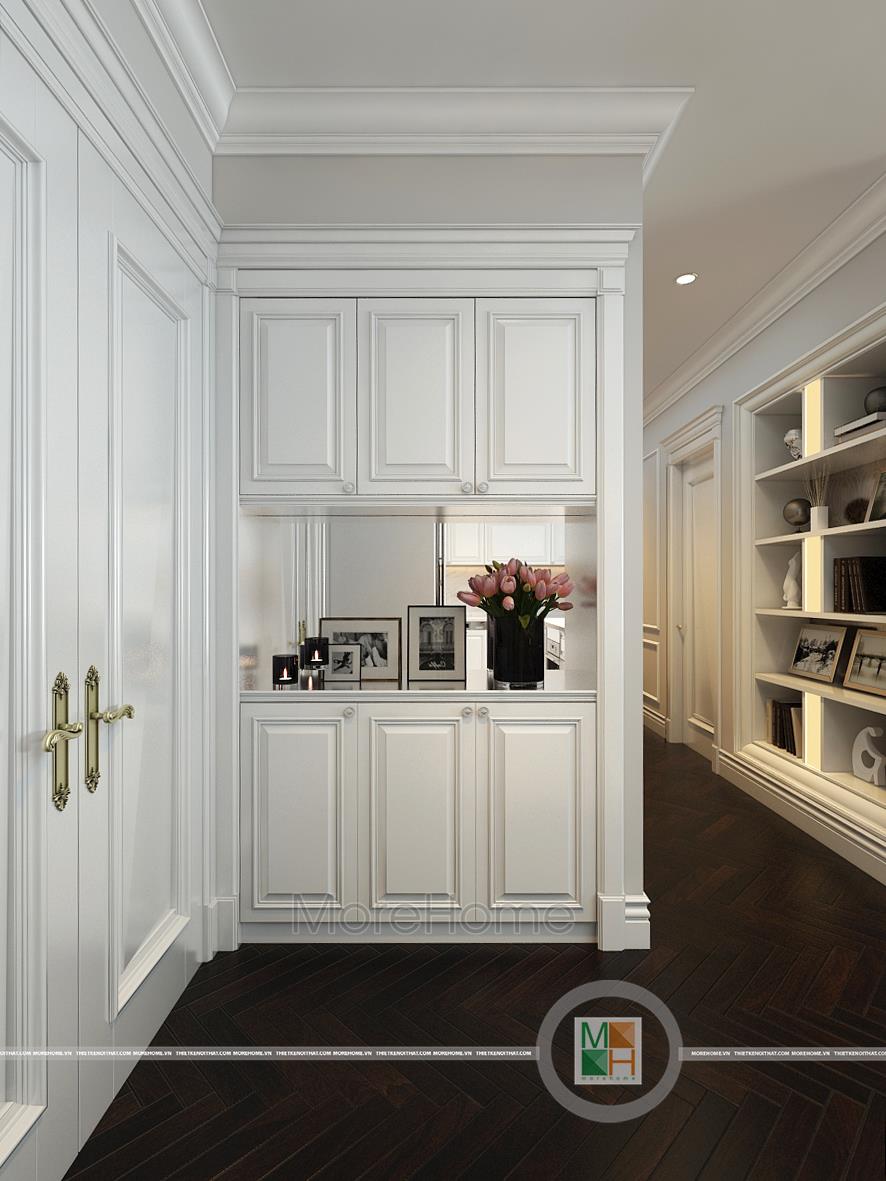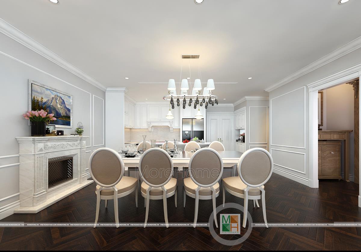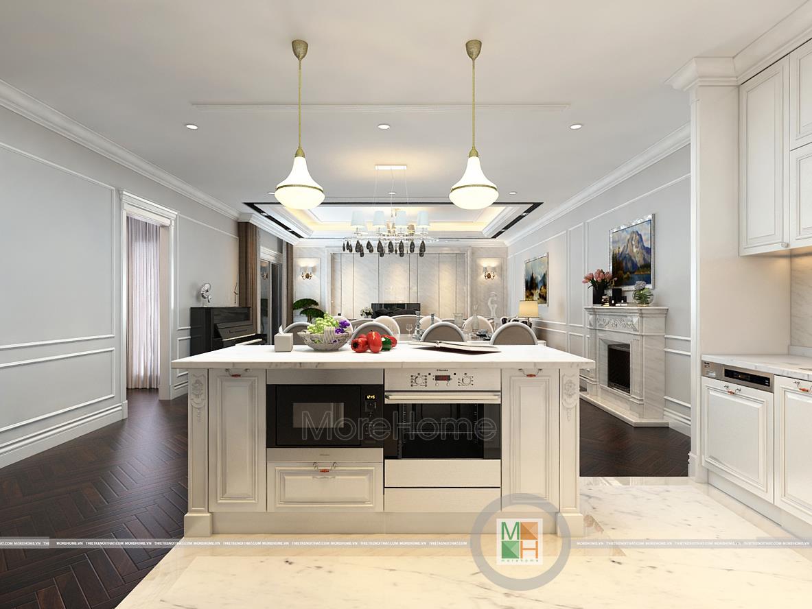 Tiếp theo là thiết kế nội thất bếp tân cổ điển. Tone màu mà kiến trúc sư ưu ái lựa chọn là màu trắng tinh khôi. Thiết kế quây gọn gàng thành một không gian riêng biệt đảm bảo tính rõ ràng trong thiết kế. Tủ bếp không quá cầu kỳ, được thiết kế đơn sắc với các nét trạm khắc tinh tế vừa đảm bảo không gian mở công năng lại vừa tạo sự nhất quán trong thiết kế tân cổ điển. Thay vì bức tường thô cứng chặn đứng không gian, kiến trúc sư đã khéo léo thay thế bằng thiết kế bệ bếp gọn gàng, chiều cao vừa phải giúp không gian mở, tăng khả năng quan sát cho gia chủ, tăng tính tiện nghi cho căn bếp.