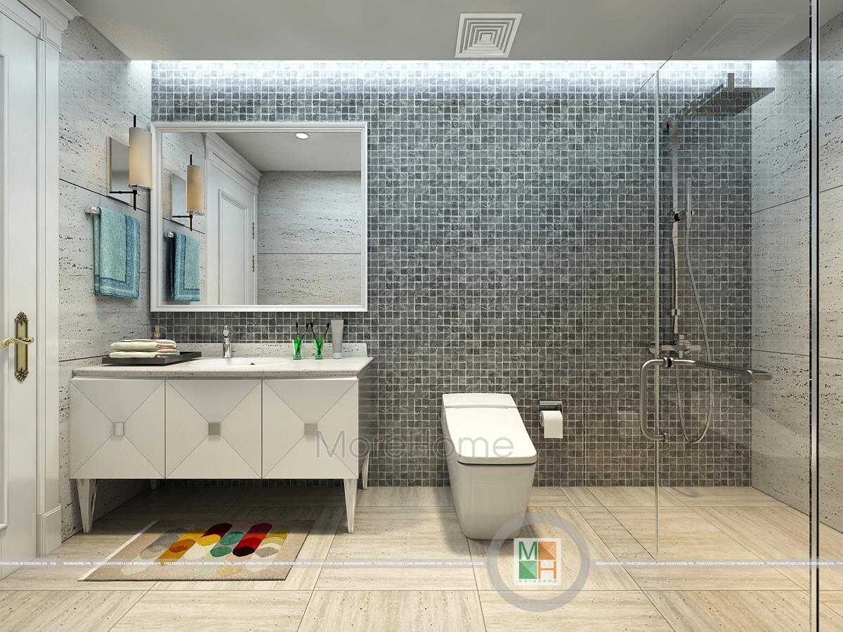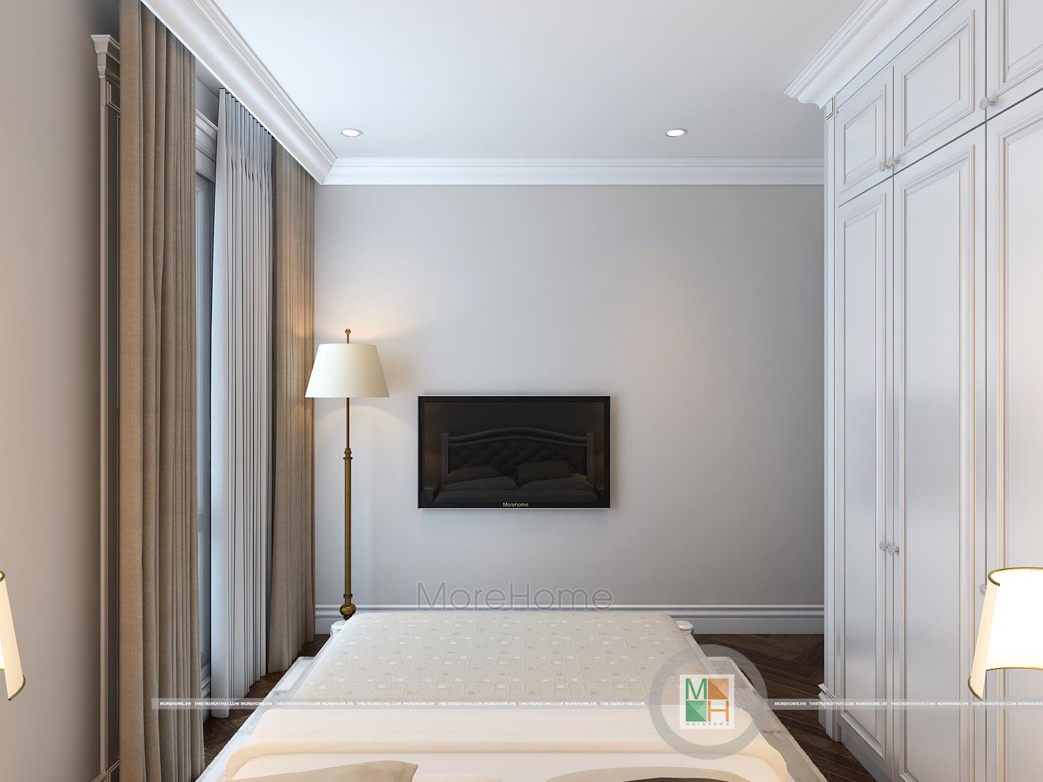 Thiết kế nội thất phòng ngủ tân cổ điển vẫn thiên về sử dụng các tone màu nhẹ nhàng, nâu sữa, ghi sáng, trắng vừa tạo cảm giác đồng nhất trong không gian lại góp phần lớn tạo cảm giác cơi nới cho căn phòng. Kính cường lực trong suốt được sử dụng để tạo không gian mở, mang ánh sáng tự nhiên vào phòng giúp mang lại hứng khởi cho gia chủ. Thiết kế kệ tủ đơn giản, gần như tạo mặt phẳng tường vừa đảm bảo tính tiện nghi lại không tốn quá nhiều diện tích.