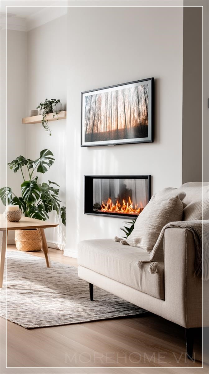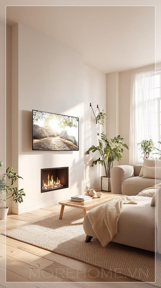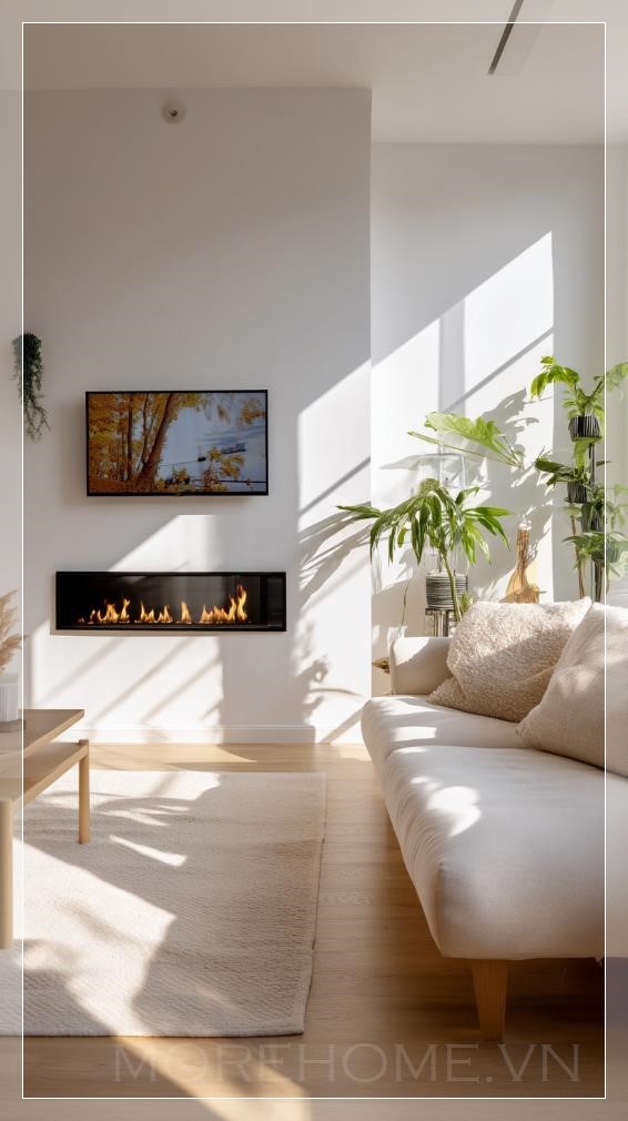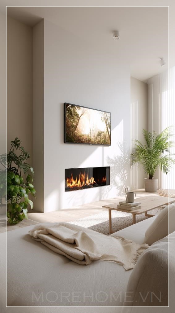 Trong không gian này, mọi thứ đều toát lên sự thanh bình và thoải mái. Ánh sáng tự nhiên nhẹ nhàng chiếu sáng khắp căn phòng, tạo nên một bầu không khí yên tĩnh và thư giãn. Bức tường trắng sạch sẽ là nền tảng cho một chiếc TV LCD gắn tường, với màn hình rộng hiển thị hình ảnh của một ngọn lửa ấm cúng hoặc một cảnh thiên nhiên thư giãn, gợi lên cảm giác thư thái mỗi khi nhìn vào.