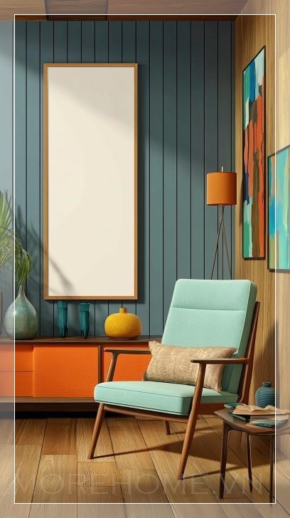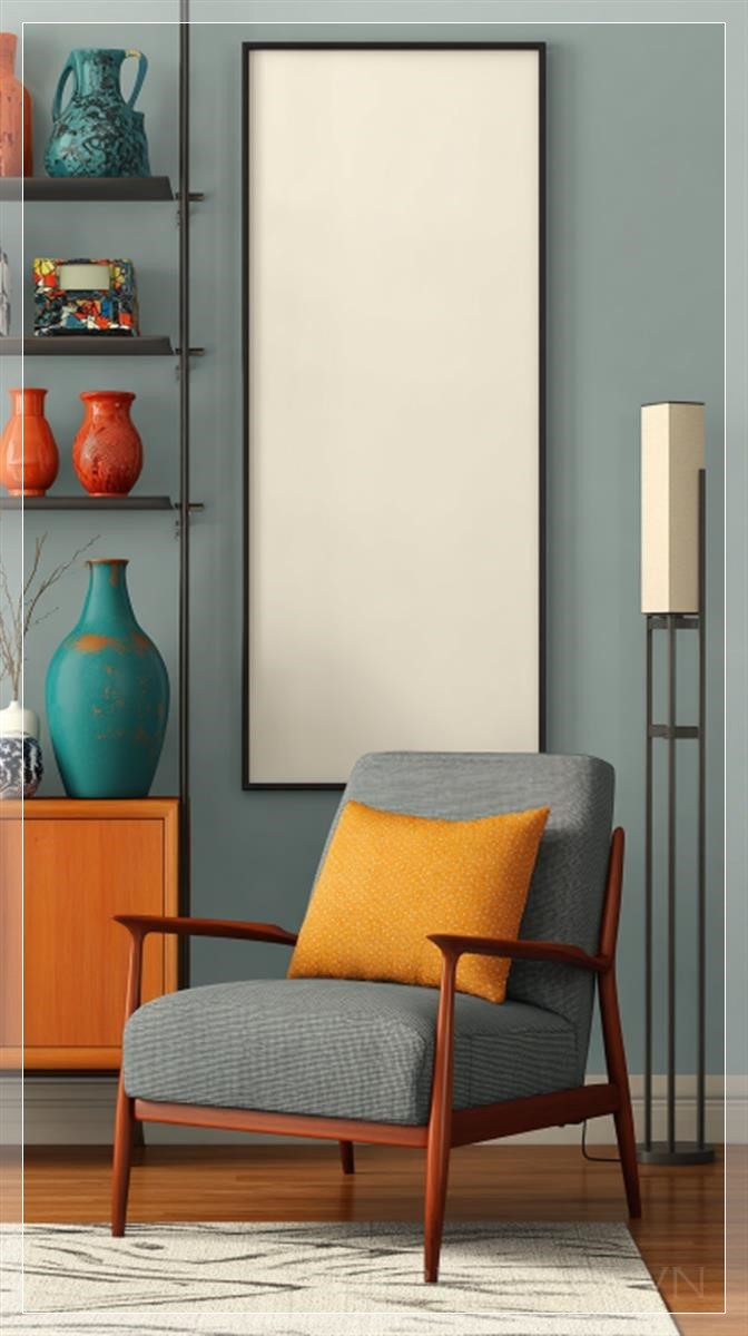 Không gian được bài trí với những món đồ nội thất mang phong cách giữa thế kỷ, như chiếc ghế bành màu nâu da cổ điển và bàn cà phê với những chi tiết kim loại mỏng, tinh tế. Những chi tiết này đều có sự tương phản tinh tế với chiếc khung tranh trắng, làm nổi bật vẻ đẹp đơn giản nhưng đầy sang trọng. Mọi thứ trong phòng đều gợi lên một không gian thư giãn, dễ chịu, với cảm giác như được bao bọc bởi lịch sử và hiện đại.